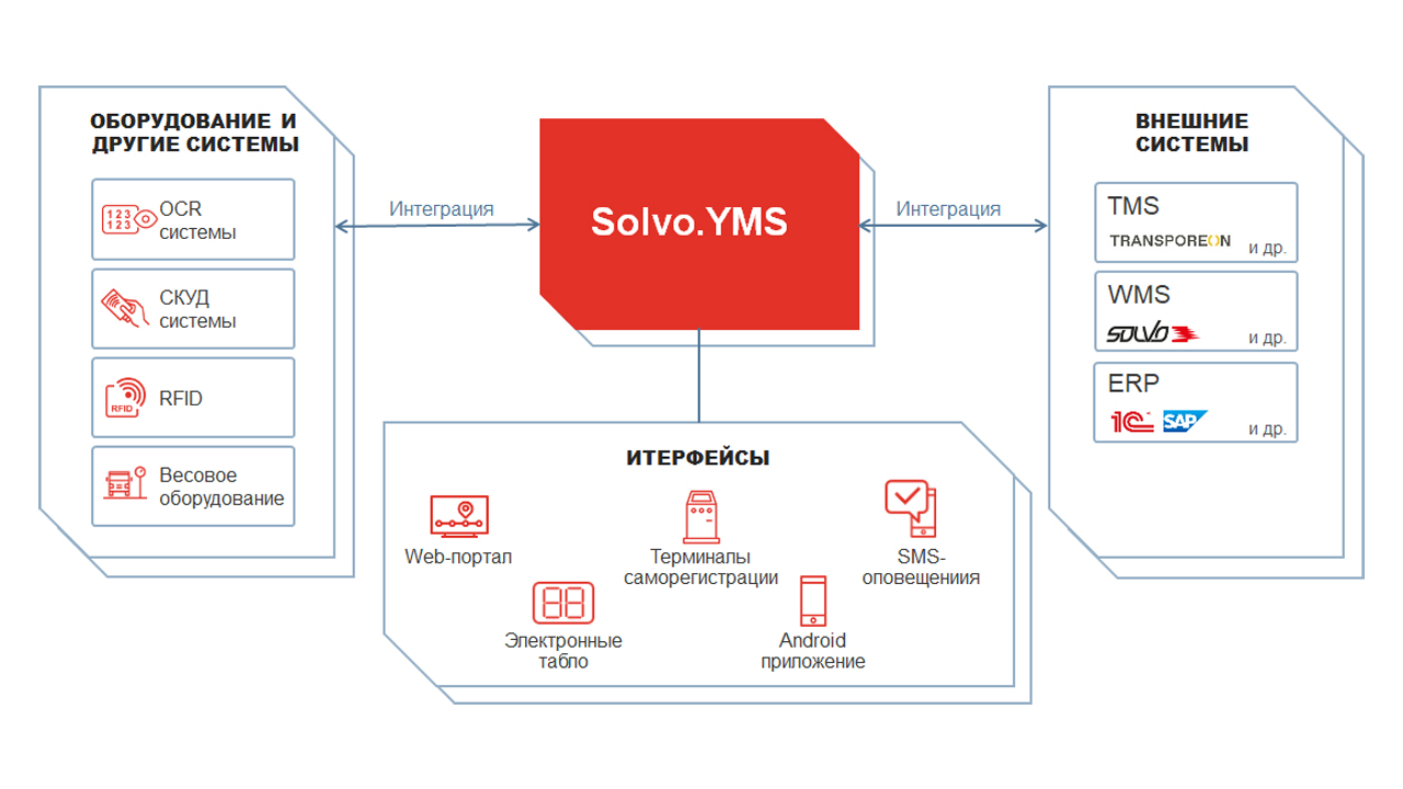 Позволяет интегрировать Solvo.YMS с IT-системами, в том числе ERP, WMS, TMS, корпоративными планировщиками или системами безопасности. Поддерживаются REST API и другие стандартные протоколы обмена.